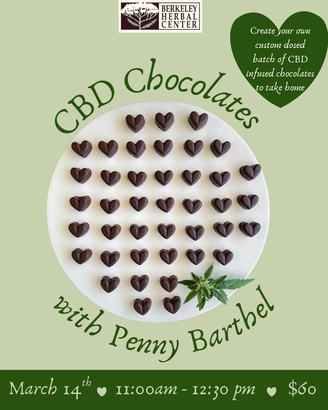 We will make delicious custom dosed CBD chocolate hearts. This class will provide grounding information about cannabidiol (CBD), an important molecule found in cannabis that offers soothing aid to the body mood without the high. Each participant will then create their own custom dosed batch of 50 tiny CBD infused chocolates to take with them. All equipment and ingredients are included.