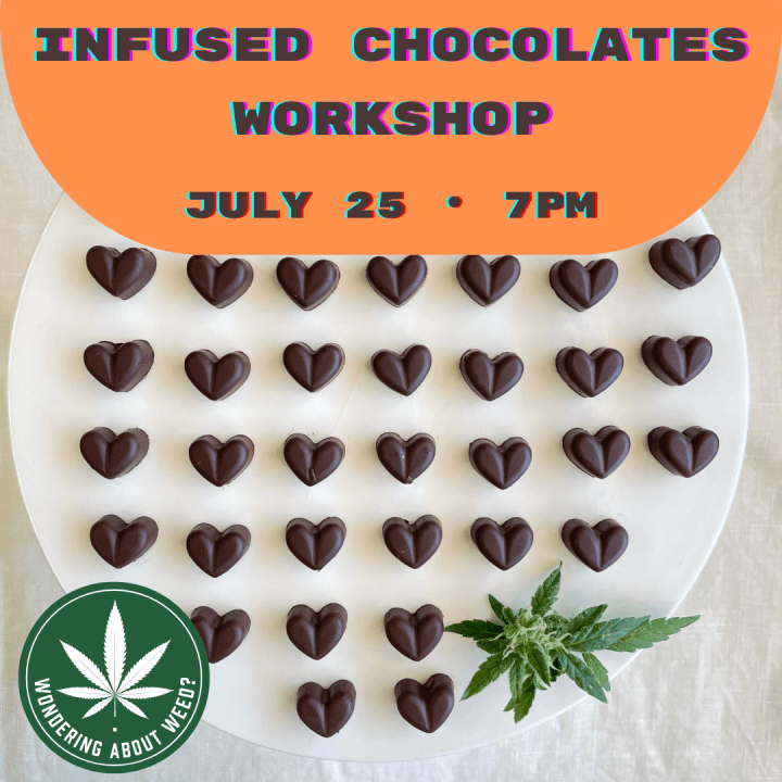 My business partner Kaisha and I will debut a workshop to teach anyone how to make their own cannabis infused chocolates! I’m really excited about this one. If you’re interested in learning how to make your own, and can be in Albany, CA on July 25th, please consider signing up for this workshop. You’ll leave with 65 custom dosed cannabis chocolates and then — when you’re ready with your own home grown cannabis — you can make more for yourself at home. Click on photo above to go to the Wondering About Weed Workshop page.