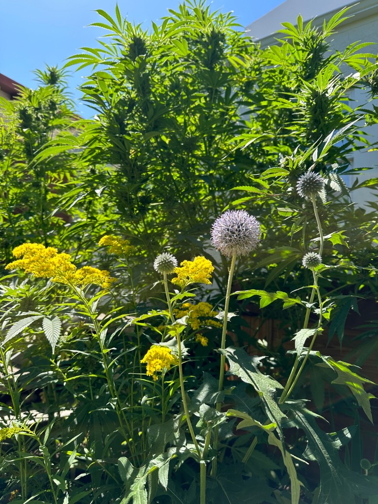 2024 has been a rich and rewarding season of growth both for me and my garden. My five stately cannabis plants are nearing ripeness, and have overtaken about 1/4 of the space in my small garden. The air is heady with weedy fragrance — all those terps! This past year I’ve had the honor of teaching hundreds of every day folks how to grow cannabis in their own gardens, outside, in the bright sunshine, happily in community with all sorts of other herbs, shrubs, bulbs, trees. Cannabis loves growing in community, and so do I.